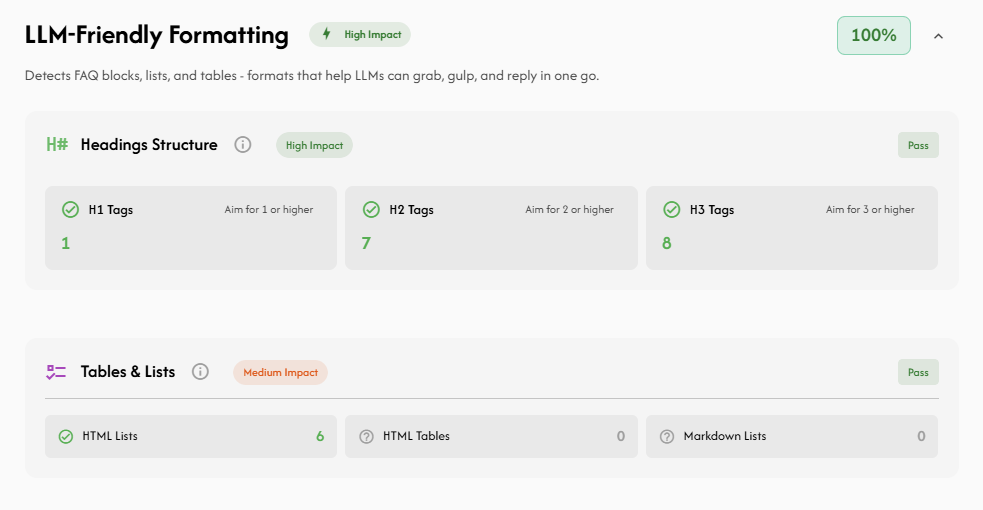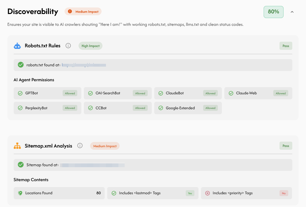 We also check for the presence of llms.txt—a critical new standard for AI SEO. Most sites lack this file, missing a primary method to spoon-feed clean, Markdown-formatted context to agents without the noise of HTML boilerplate.
