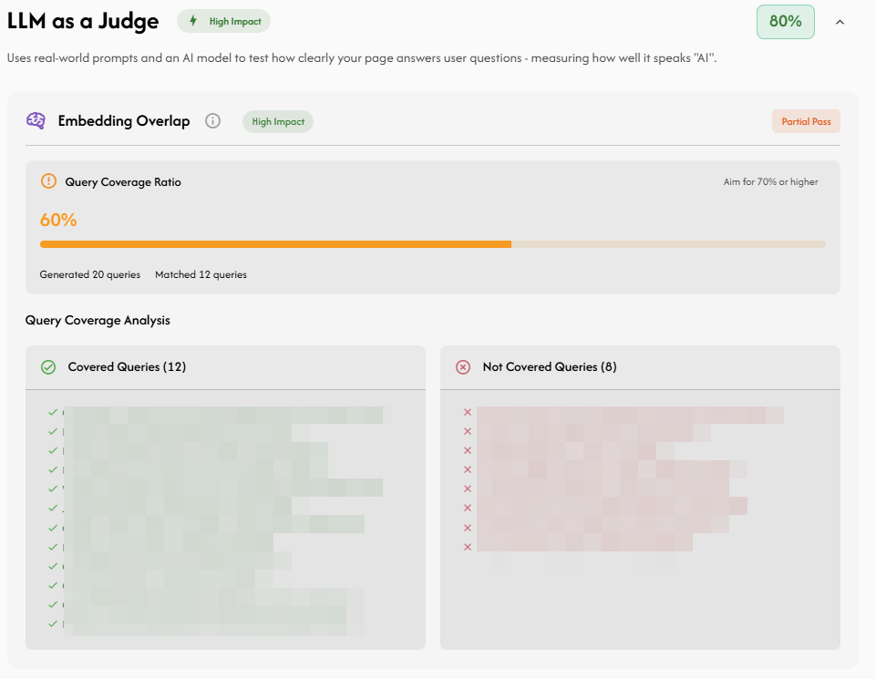You receive a Query Coverage Ratio. A low score means your content is structurally sound but semantically thin—leaving models unable to confidently cite you as a source.